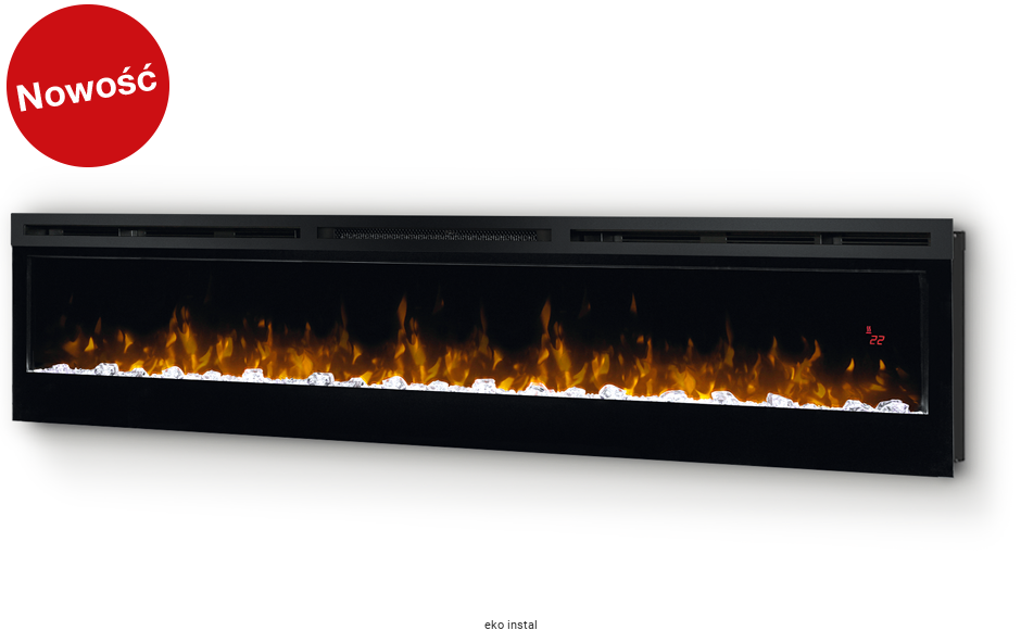 Panoramiczny kominek ścienny wyposażony w efekt płomienia Optiflame LED i palenisko z akrylowymi kostkami lodu imitującymi diamenty, dodatkowo wzbogacone efektem mieniących się kolorowych świateł LED. Ta opatentowana technologia sprawia, że światło kominka wygląda nadzwyczaj efektownie. Jest to poszerzona wersja modelu PRISM 50" LED i zarazem jeden z najdłuższych kominków elektrycznych na rynku (188 cm). Wyposażony jest w termowentylator z termostatem, zintegrowany wyświetlacz LED, przełącznik mocy grzewczej i multifunkcyjny pilot zdalnego sterowania. Doskonałym sposobem na szybki i łatwy montaż kominka PRISM 74" LED na ścianie jest zastosowanie RAMY 74" dostępnej w kolorze ciemnego orzecha, czarnym lub białym.