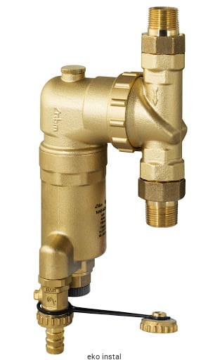 Separator zanieczyszczeń RBM MAG-NUS 2 to najlepsze rozwiązanie problemów systemowych spowodowanych zanieczyszczeniami cząsteczkowymi, zwłaszcza rdzą i piaskiem, które powstają w wyniku korozji. To urządzenie przyczynia się do utrzymania wysokiej wydajności systemu, zapobiegając zatykaniu się rur i awariom kotłów, samoczyszczący filtr eliminuje wszystkie zanieczyszczenia systemu grzewczego. Przechodząc przez instalację, woda przechodzi przez siatkę wkładu i wchodzi do komory filtracyjnej. Nagła zmiana przekroju instalacji (komora filtrująca ma znacznie większą średnicę) spowalnia ruch wody, a w konsekwencji szybkość porywania zawieszonych w nim cząstek. Cząsteczki zderzają się z siatką wkładu filtracyjnego, a następnie zwalniają. Cięższe cząstki spadają w dół z powodu grawitacji, która przeważa nad siłą oporu. Wkład ze stali nierdzewnej, ze względu na swój szczególny spiralny kształt i siatkę o bardzo wysokim stopniu filtracji, nie zapewnia odporności na przepływ wody (niskie spadki ciśnienia) i zachęca do spiralnego ruchu, który powoduje, że zanieczyszczenia zbliżają się do dna. Magnes w komorze filtra przyciąga wszystkie zanieczyszczenia o charakterystyce magnetycznej: w ten sposób wszystkie zanieczyszczenia magnetyczne (pozostałości żelaza) i zanieczyszczenia niemagnetyczne (glony, błoto, piasek...) w systemie zostają zachowane. Poprzez ręczne otwarcie zaworu spustowego na dnie komory filtracyjnej i pozostawienie wody na kilka sekund, wszystkie zanieczyszczenia są usuwane.