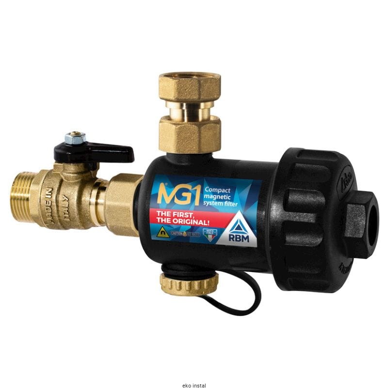 Rbm MG-1 to filtr magnetyczny instalacji c.o do montażu pod kotłem. Dzięki kompaktowym wymiarom może być instalowany w miejscach o ograniczonej powierzchni zarówno w pionie, jak i poziomie.